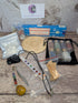 Bundle set! 7 small jars of Chakra colored chips, small grid, Clear Quartz pebbles, 7 small raw chakra color pieces, incense sticks, black Obsidian raw stone that is incense holder, 2 small Palo Santo sticks, a metal feather chakra colored bead book marker and a Satin Spar chakra wired bead bar that is a necklace.