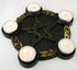 A combination of mystical symbolism with practical use, this altar plate displays a pentagram, with five smaller pentagrams settled at each of its points to hold tea light candles. 7” x 3/4”