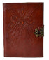 Description:This leather blank book, has a beautifully tooled, embossed, owl with an eight at front center. The back cover is fully embossed with diagonal style tooling design, its spine edge has attractive leather cross stitching, secured by a metal brass colored latch. 5" x 7" - 240 pages - Unlined. Pages of Handmade Linen Parchment Paper.