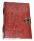Hand tooled lined leather journal with embossed with a stylized Sun. Border embossing may vary. Size may vary slightly. Leather, handmade paper. 192 pages, latch closure. 5” x 7”, (made from goat leather).