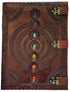 Description:A massive tome with three latches to keep it closed and a line of 7 Chakra stones running down the front over the simple mandala centered on the cover. Embossing at the edge and on the rear cover may vary. Size may vary slightly. 180 blank, handmade, linen parchment paper pages. 13 1/2" x 18", (made from goat leather). Latches show signs of oxidation.