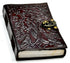 This attractive leather blank book, has a beautifully tooled front cover, embossed with a Tree that is front center, a pair of howling wolfs at the base of its trunk, an arch is embossed above, who's top corners are bordered with Celtic knot designing and a Pentacle at very top center. The back cover has beautiful embossed diagonal design, its spine edge has attractive leather cross stitching, its inside contents is secured a solid metal bronze colored latch. Its measurements are 5" x 7", with 240 blank (unlined) pages.